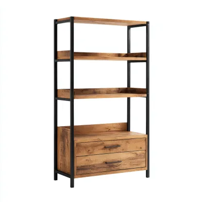 La bibliothèque comprend des surfaces ouvertes adaptées au rangement de livres ou accessoires ainsi qu'un espace inférieur équipé de tiroirs permettant de conserver certains éléments à l'abri de la poussière.