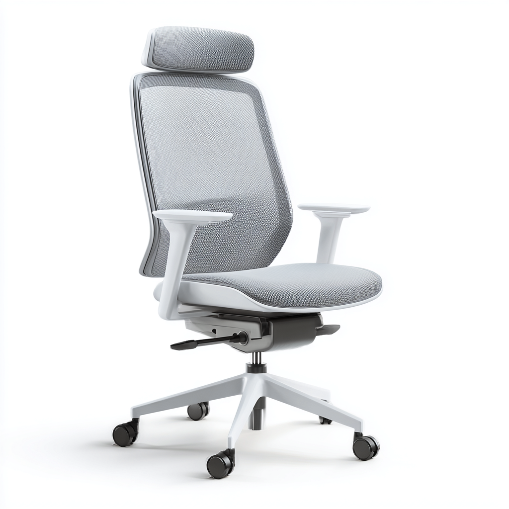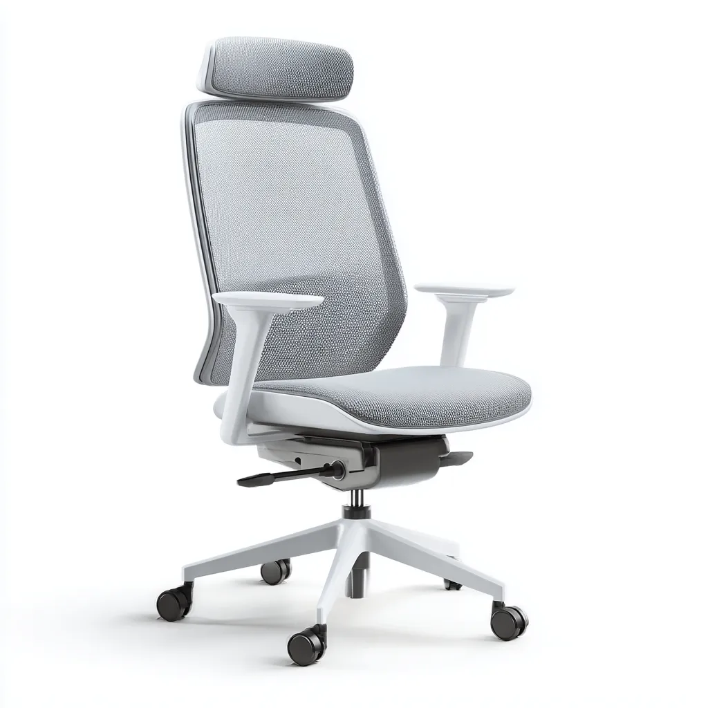 La chaise dispose d'un dossier ergonomique en tissu respirant, d'un appui-tête confortable et d'accoudoirs fixes. La base pivotante avec roulettes facilite la mobilité et améliore l'expérience d'utilisation.