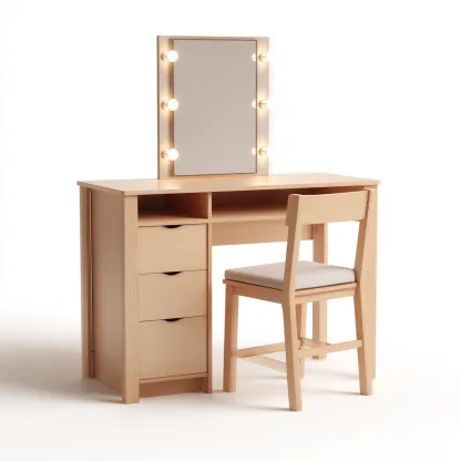 Cette coiffeuse en bois beige présente une structure simple et fonctionnelle, idéale pour organiser l'espace beauté avec un style moderne et épuré.