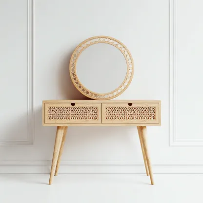 Cette coiffeuse en bois naturel associée à des façades en rotin tressé offre une esthétique artisanale et épurée. Le miroir rond assorti apporte une touche décorative et assure un usage confortable pour les routines quotidiennes.