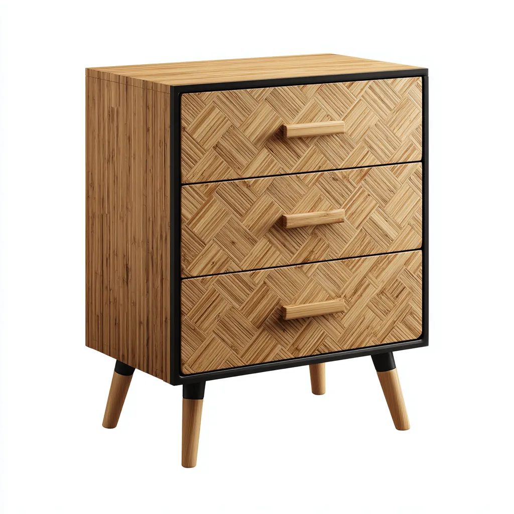La structure est réalisée en bois avec une finition naturelle, tandis que les façades présentent un motif géométrique raffiné. Les pieds inclinés assurent une stabilité fiable et un style contemporain.