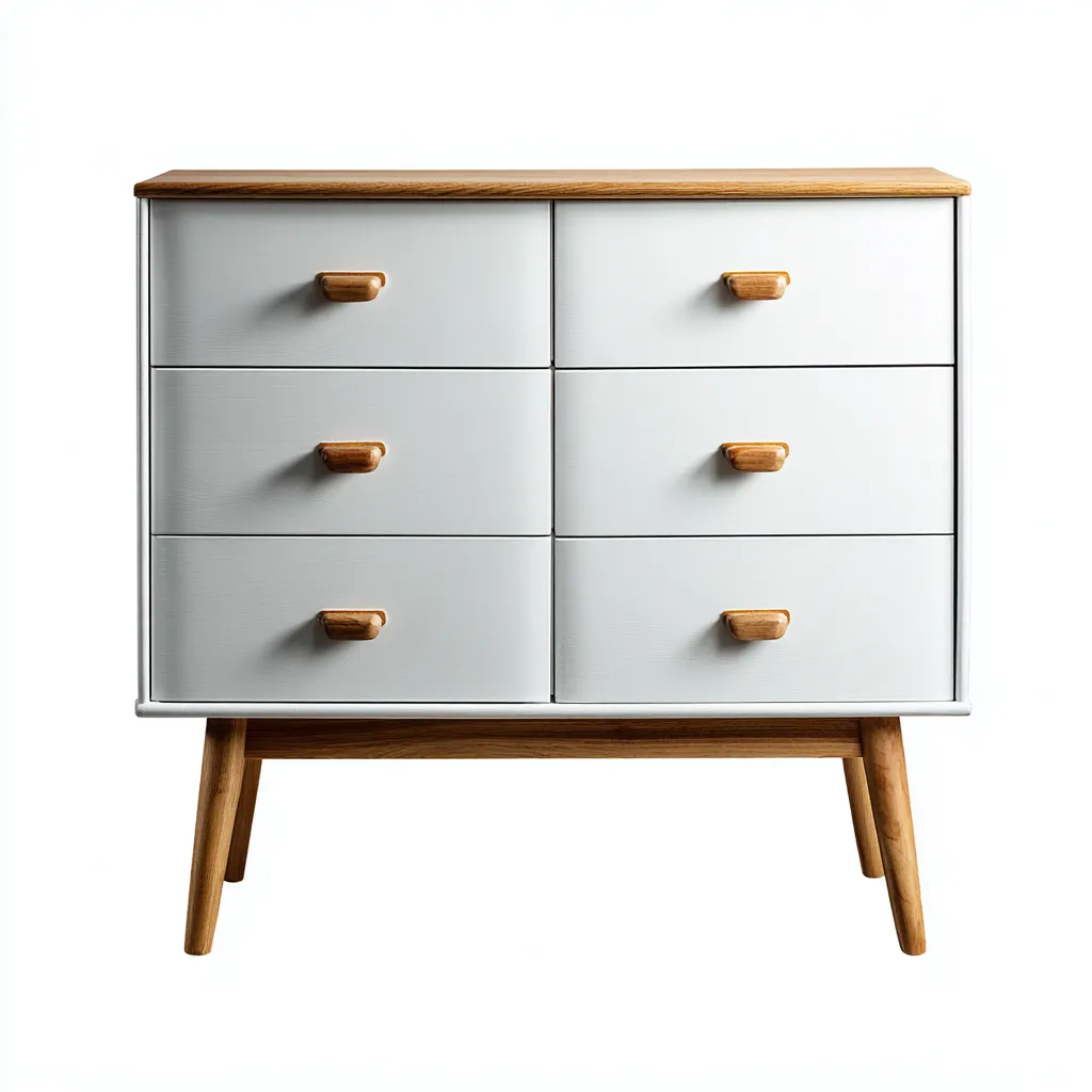 Cette commode au style scandinave associe une structure blanche épurée à un piétement en bois naturel pour une allure légère et moderne.
