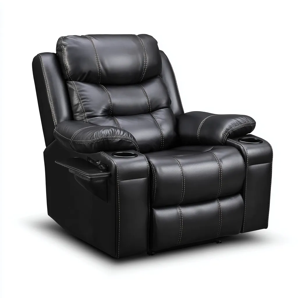 Ce fauteuil relax en similicuir noir offre une assise enveloppante et confortable, idéale pour créer un espace de détente dans le salon.
