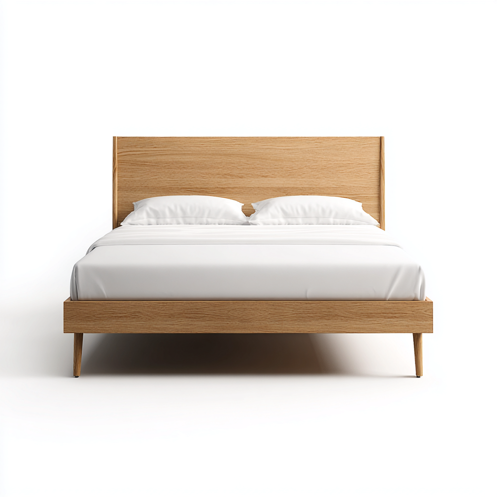 Le cadre est fabriqué en panneaux bois finition chêne clair avec une texture lisse. La tête de lit large apporte un soutien confortable et complète l'esthétique du lit.