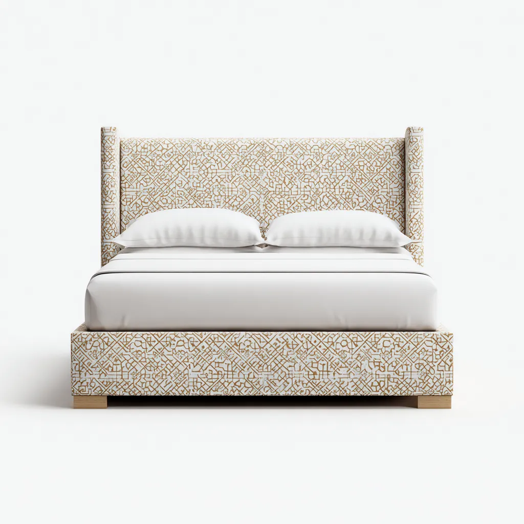La structure est réalisée en panneaux bois recouverts d'un tissu beige imprimé d'un motif doré géométrique. Les finitions soignées renforcent le caractère esthétique du lit.