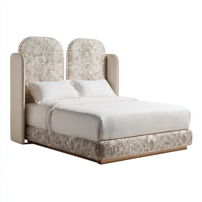 Ce lit double en tissu blanc présente une silhouette moderne et élégante, caractérisée par une tête de lit haute aux formes arrondies et un revêtement décoratif subtil.
