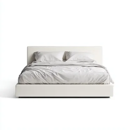 Ce lit double au design moderne est conçu pour apporter confort et élégance à la chambre. Sa structure basse et son revêtement en tissu clair créent une ambiance apaisante et harmonieuse.