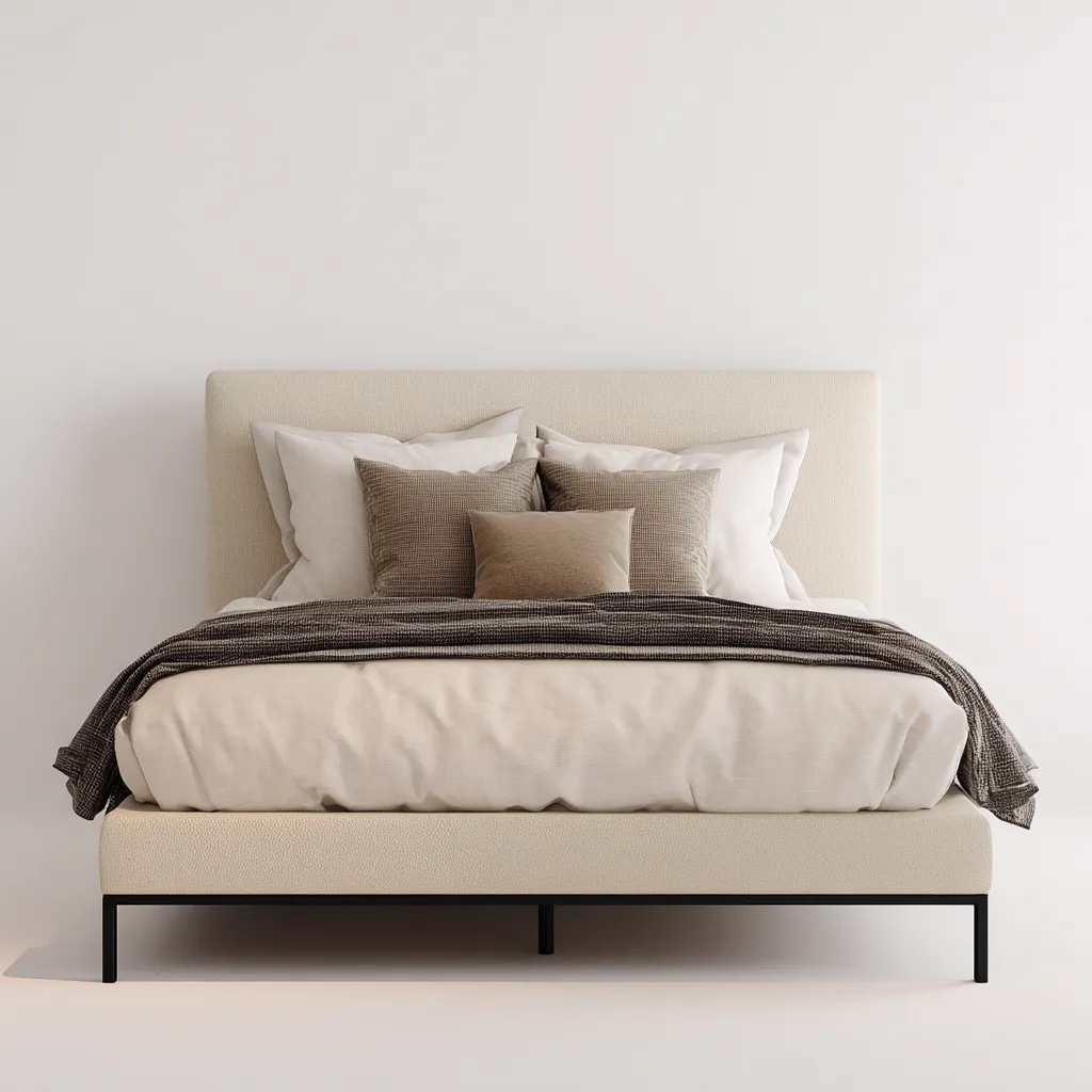Ce lit double en tissu beige présente un style moderne et minimaliste grâce à sa structure épurée et sa tête de lit rembourrée. Sa silhouette sobre crée une atmosphère douce et élégante dans la chambre.