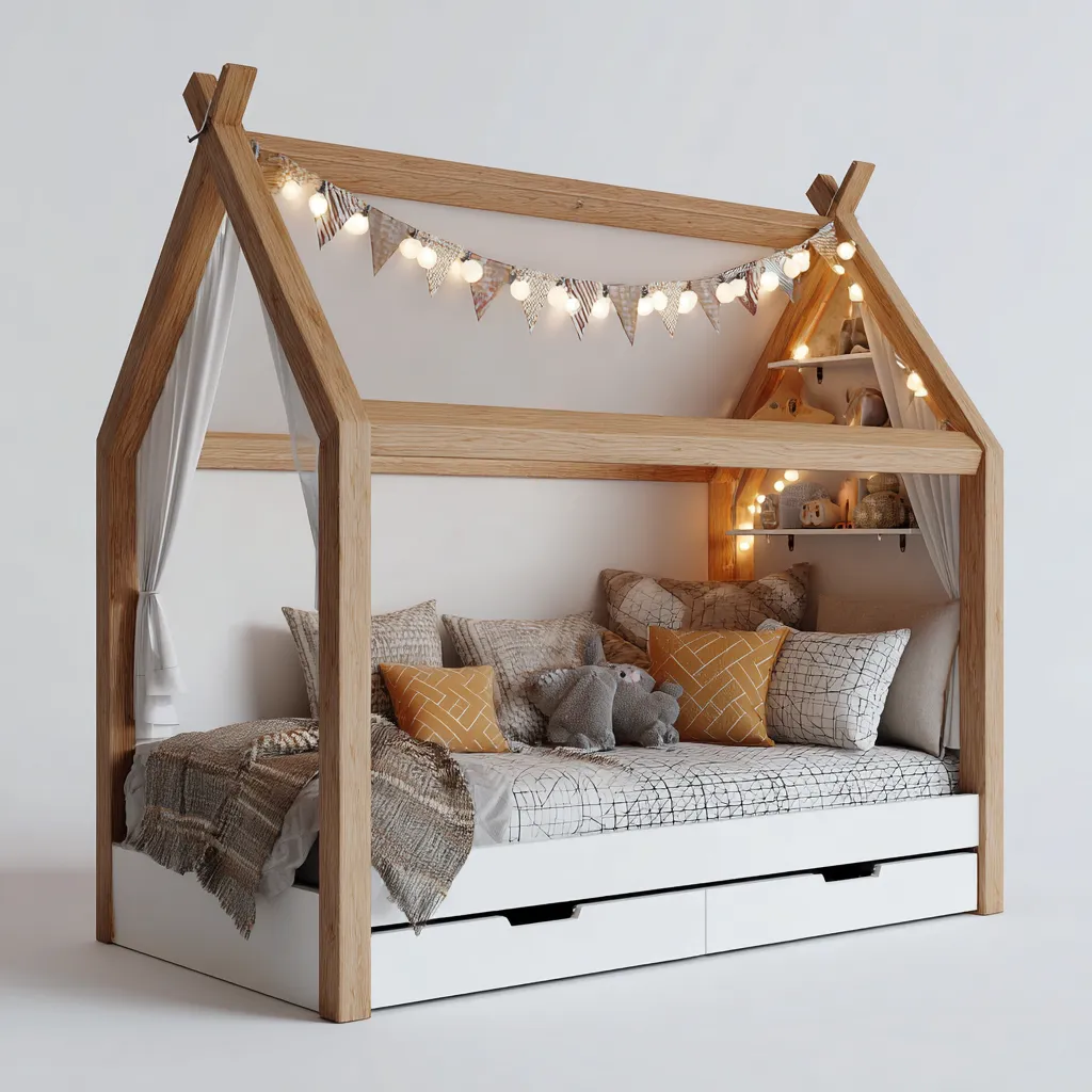 Ce lit enfant en bois adopte une structure en forme de maisonnette, combinant un cadre brun naturel et une base blanche pour créer un espace chaleureux et ludique dans la chambre.
