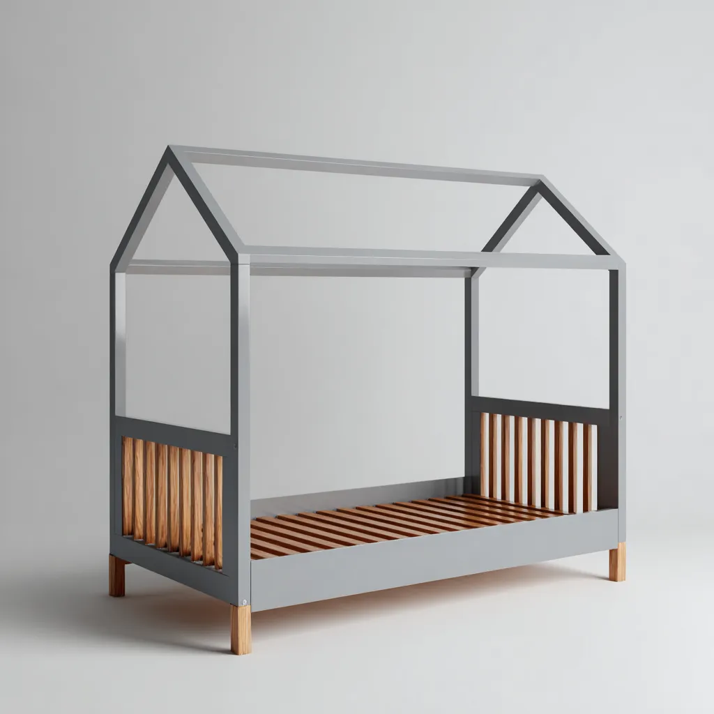 Ce lit enfant en forme de petite maison offre un espace de repos ludique et sécurisant pour la chambre. Sa structure ouverte et ses lignes épurées créent une ambiance moderne et chaleureuse.