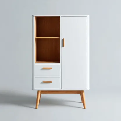 Ce meuble de rangement de cuisine au style moderne offre une solution pratique pour organiser divers ustensiles et accessoires. Sa combinaison de blanc et de bois naturel crée une esthétique douce et harmonieuse adaptée aux intérieurs contemporains.