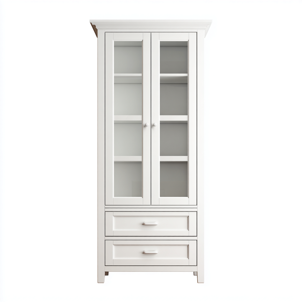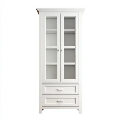 La structure est réalisée en bois peint en blanc avec une finition lisse. Les portes vitrées offrent une visibilité directe sur l'espace intérieur, ajoutant une touche élégante.