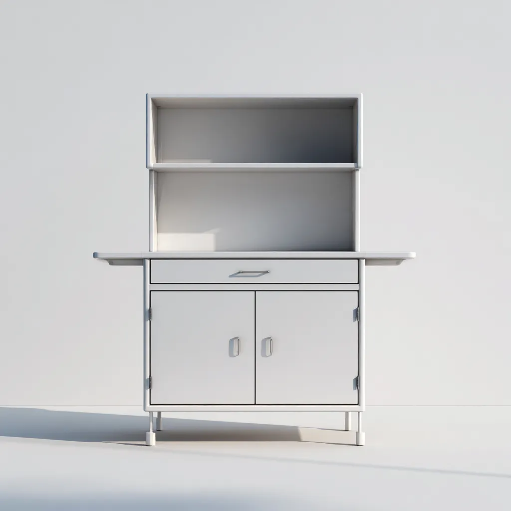 La structure est conçue en métal peint en blanc avec une finition lisse. La surface supérieure offre un espace pratique pour la préparation ou la présentation d'objets.