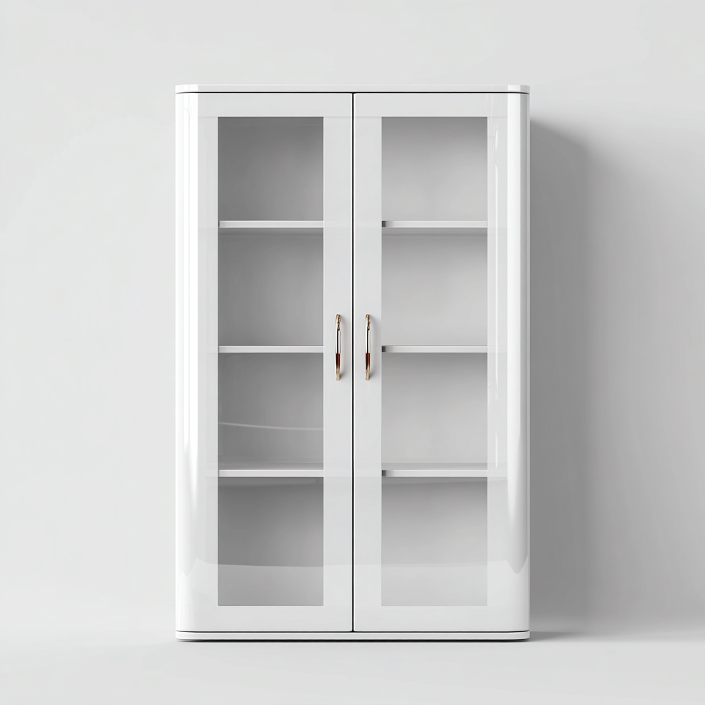 La structure est réalisée en panneaux de bois à finition blanche brillante, associée à des portes vitrées transparentes. Les poignées métalliques assurent une ouverture confortable.
