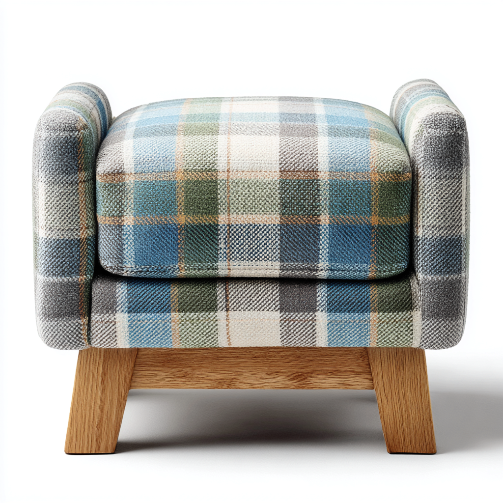 Le pouf est revêtu d'un tissu à carreaux multicolore au toucher doux, associé à une base en bois offrant stabilité et durabilité.
