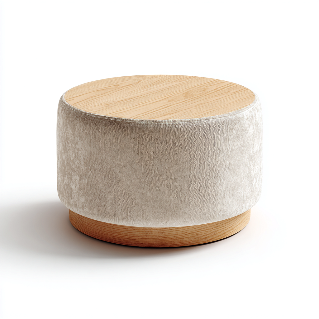 Le pouf est conçu avec un revêtement en velours beige doux au toucher, associé à une base et à un plateau en bois clair pour une finition naturelle et harmonieuse.
