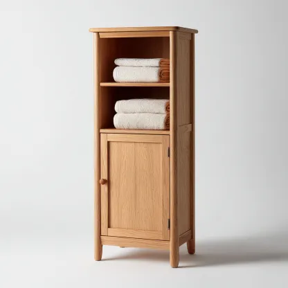 Ce rangement de salle de bain en bois offre une solution pratique et chaleureuse pour organiser les serviettes et accessoires du quotidien.