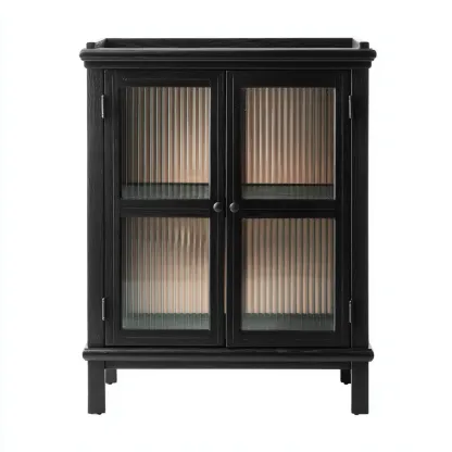 Cette vitrine en bois noir présente une esthétique élégante et intemporelle. Ses portes en verre strié créent un effet visuel raffiné tout en conservant une atmosphère chaleureuse dans la pièce.