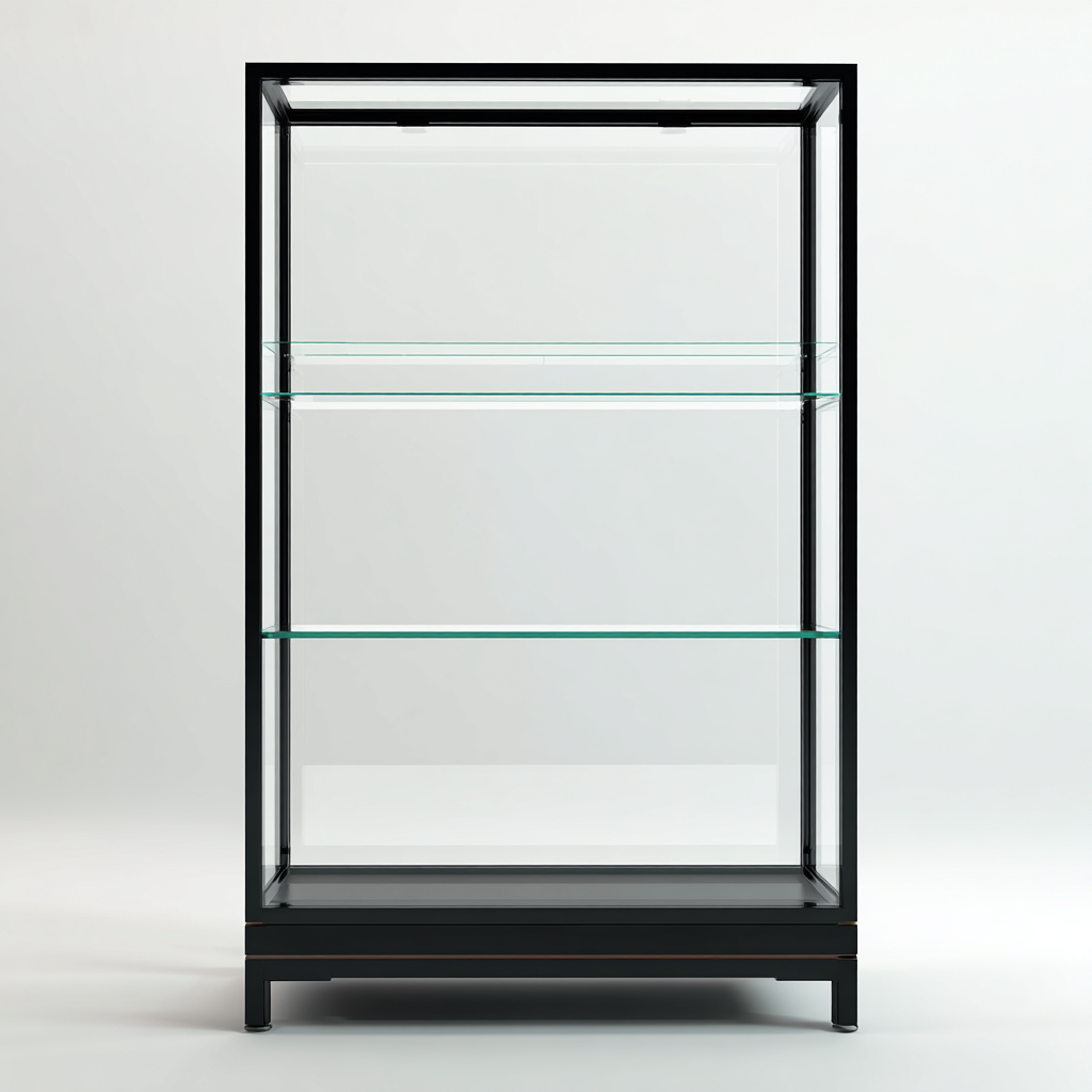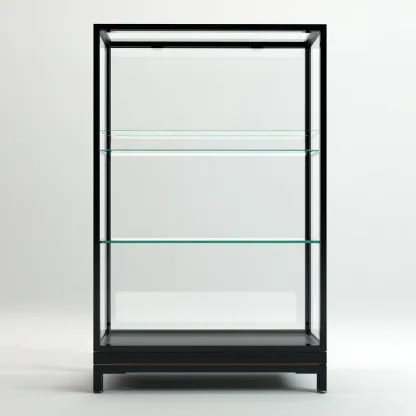 Cette vitrine en métal noir et verre transparent présente une esthétique épurée, idéale pour exposer des objets décoratifs ou des articles de collection dans un intérieur contemporain.