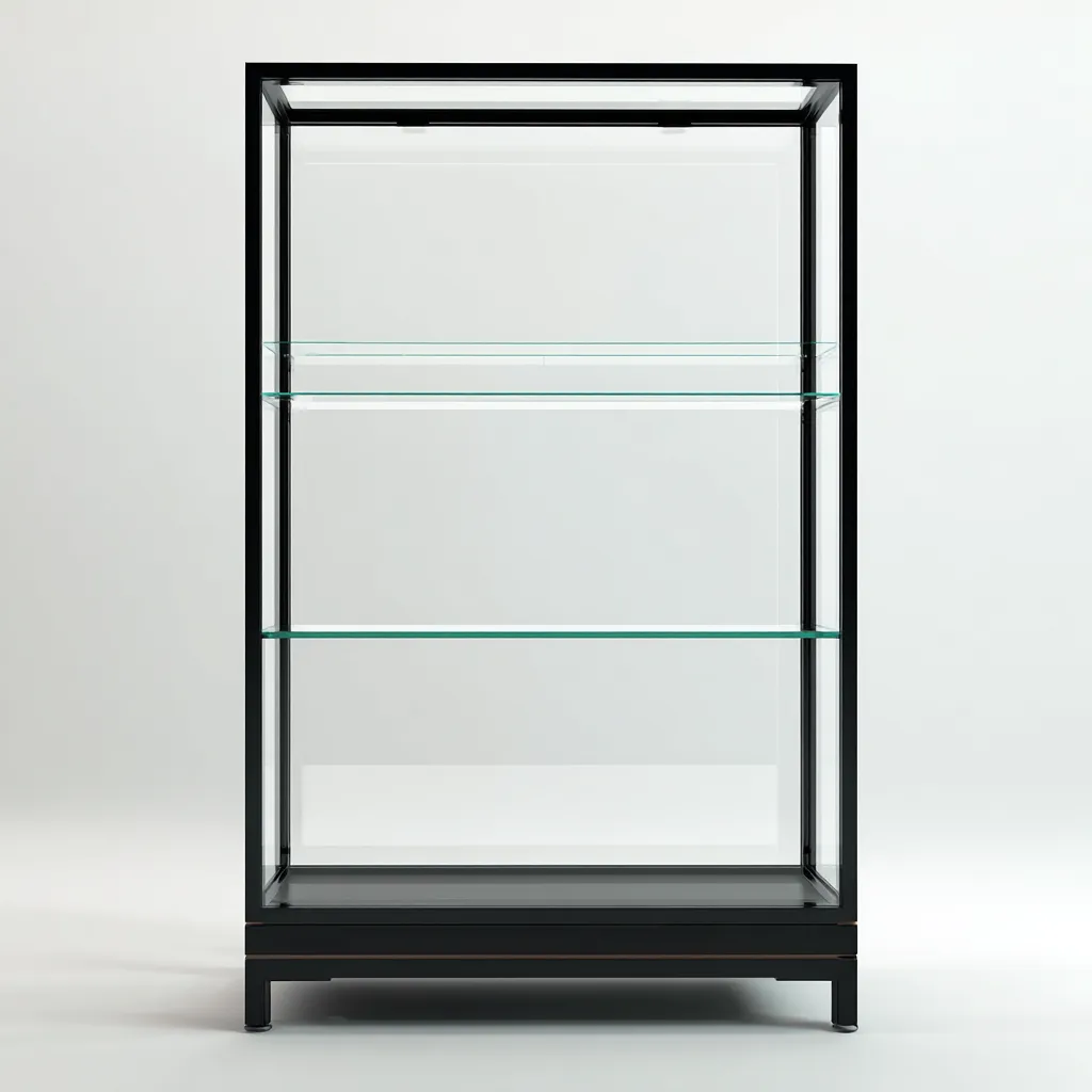 La structure en métal assure une excellente stabilité tandis que les surfaces vitrées offrent une visibilité claire et élégante. L'intérieur permet la mise en valeur des objets exposés.